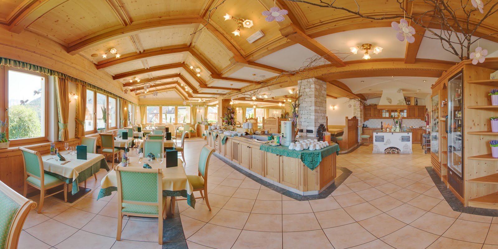 Nicht nur aus den meisten der Zimmer und Suiten des Antermoia, sondern auch vom hell und gemütlich gestalteten Speisesaal aus bietet sich Ihnen ein grandioser Panoramablick auf die Felsmassive der Dolomiten. Ein reichhaltiges Frühstücksbuffet erwartet Sie dort zum Auftakt Ihrer ereignisreiche Tage, während ein im Rahmen der Halbpension serviertes 4-gängiges Abendmenü einen weiteren kulinarischen Höhepunkt bietet. Als Besonderheit erwartet Sie im Antermoie eine traditionell gestaltete Stube, wie sie einst für viele Tätigkeiten den Mittelpunkt eines bäuerlichen Lebens bildete.