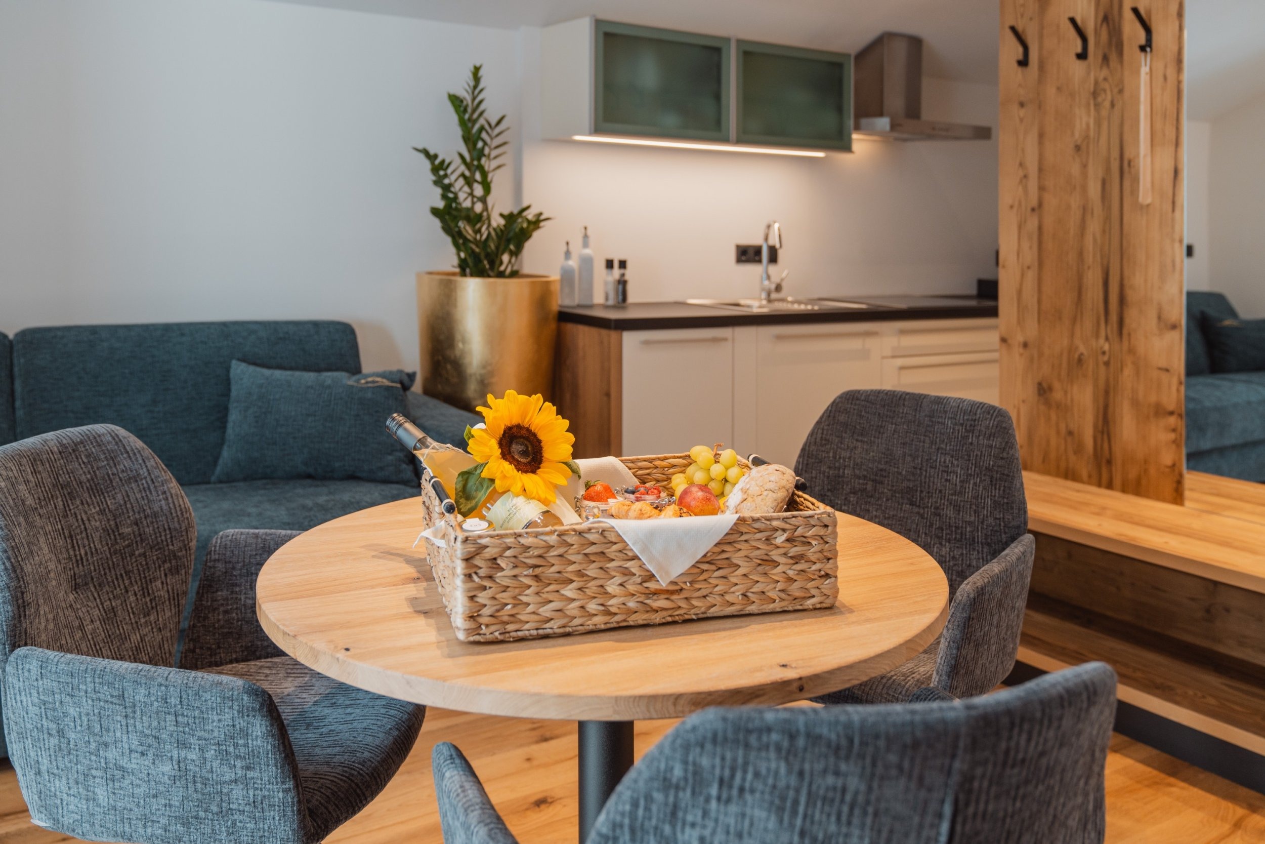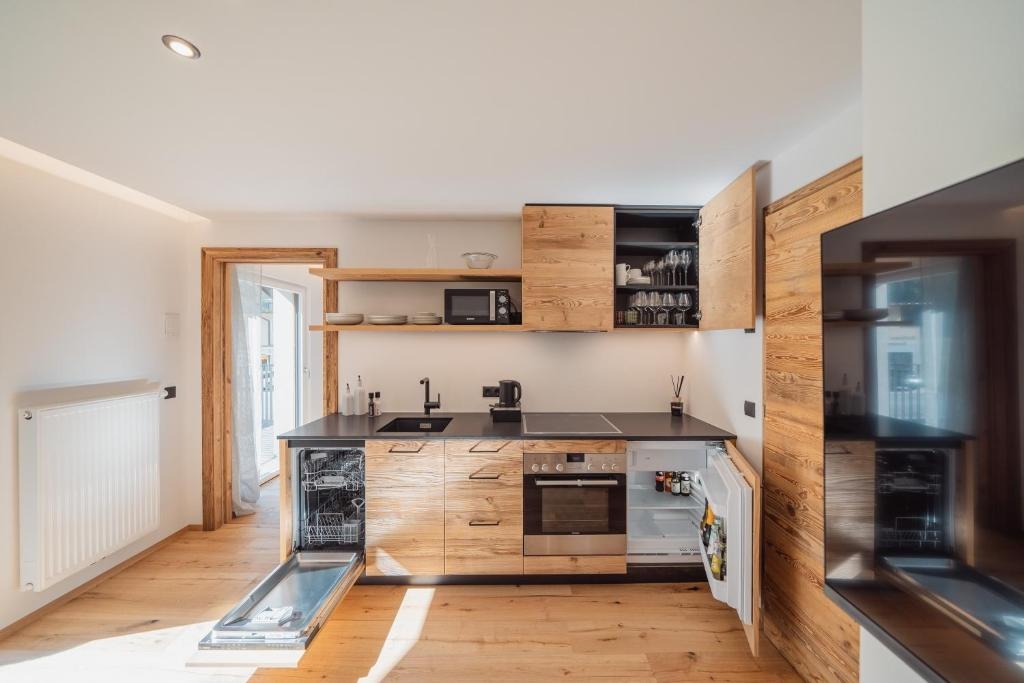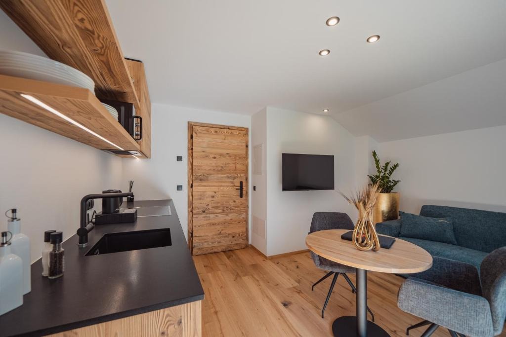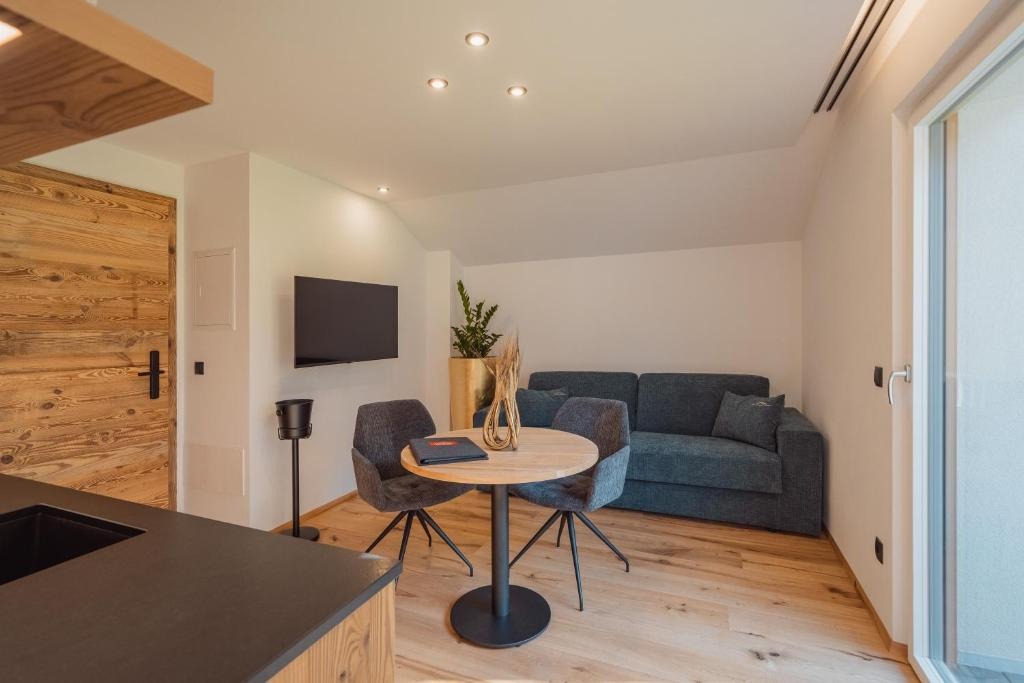 Die hochwertig ausgestatteten Apartments überzeugen durch klare Linien, helle Räume und natürliche Materialien. Großzügige Wohnbereiche, voll ausgestattete Küchen und private Balkone oder Terrassen schaffen viel Freiraum und Unabhängigkeit. Die stilvolle Einrichtung sorgt für eine warme Atmosphäre, in der man sich sofort zuhause fühlt – ideal für Paare, Familien oder Ruhesuchende.